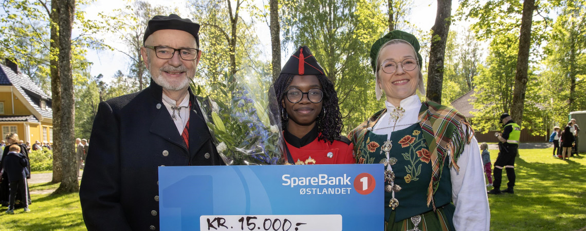 Vinner Eidsvoll kommunes kulturstipend 2025, Manyang Birgitte Ojong-Nsi, med utdeling 17. mai 2025. Fra venstre: Tord Langmoen (leder for Hovedutvalg for kultur og medborgerskap), vinner Manyang Birgitte Ojong-Nsi og Janne Berglund.